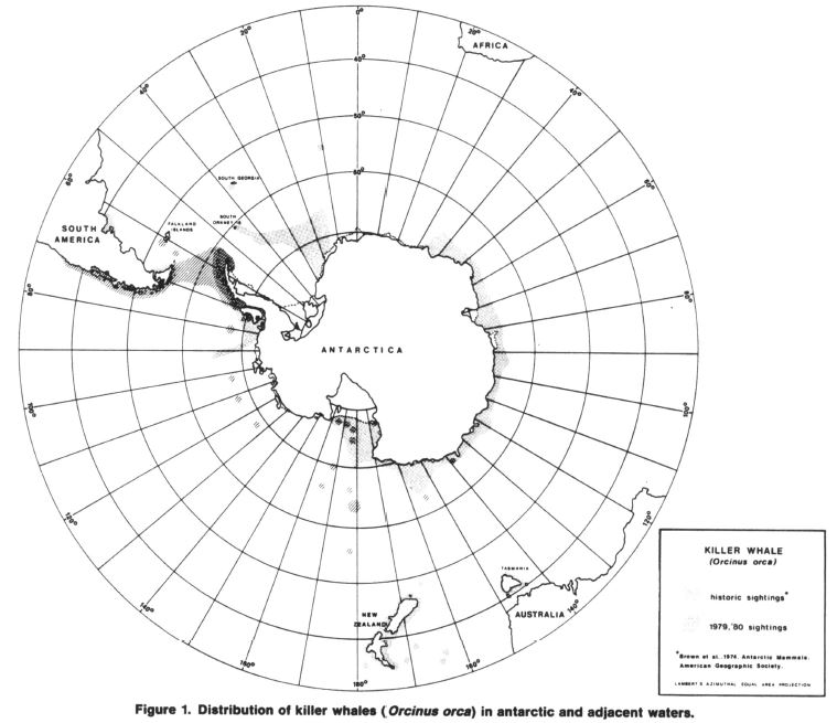 Boat surveys of Antartic and adjacent waters in the 1970s and 1980s, documenting killer whale color patterns and geographical variablility of killer whale vocalizations. Researchers assessed the range and abundance of killer whale pods to understand the ecological role of these whales. Distribution records, photographs of color patterns and recordings of underwater killer whale vocalizations were taken during various ship transects.